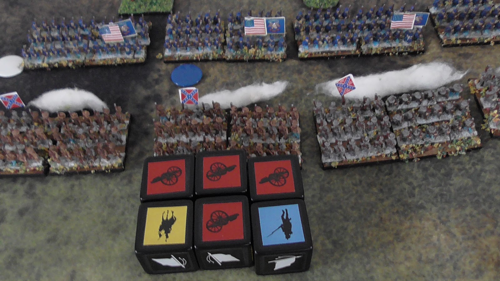 Before the battle begins, one thing I had omitted from my home spun rules, was an army break point. I don't want this battle to be a slug fest, last man standing type affair. That rarely happens in battles of any period, let alone the American Civil War. The elan counters, record the spirit, morale, cohesion not the casualties suffered. An infantry battalion has six elan if fresh, if it is reduced to one elan, it doesn't mean the unit of 300 or so men, has been reduced to just 50, it just means the unit is spent, the men just cannot take any more, they are no longer able to function as a unit.